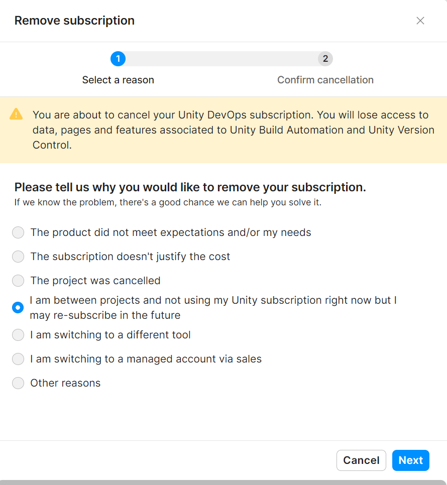 협업 프로젝트가 완성되거나 취소되는 등의 이유로 DevOps나 버전 컨트롤을 구독 취소하고 싶을 때가 있다. 본인 같은 경우도 그랬는데 찾아봐도 자세한 설명이 없어 애먹었다. Unity Gaming Services