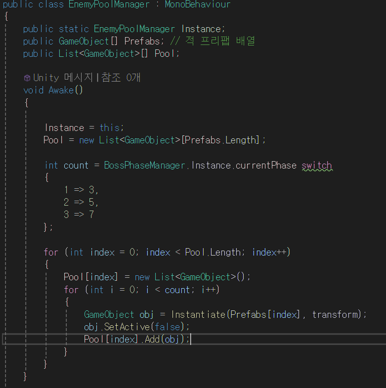 또한 페이즈마다 잡몹이 소환되는 갯수와 타이머를 조정하였다. 역시 보스 페이즈의 페이즈 변수를 인스턴스화하여 전역으로 참조하니 활용하기가 참 쉬었다. 이것이야말로 싱글톤 패턴을 사용해보며 가장 유용했던 경험이 아닐까 한다