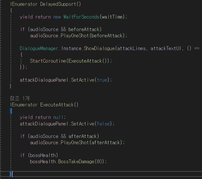 코드의 내용은 간단하다. 처음에 플레이어가 NPC에게 말을 건 뒤 일정 타이머가 끝날때 방어막이 해제된다. 이때부터 25초 뒤에 지원사격이 시작되므로 waitTime(=25f) 동안 기다려준다